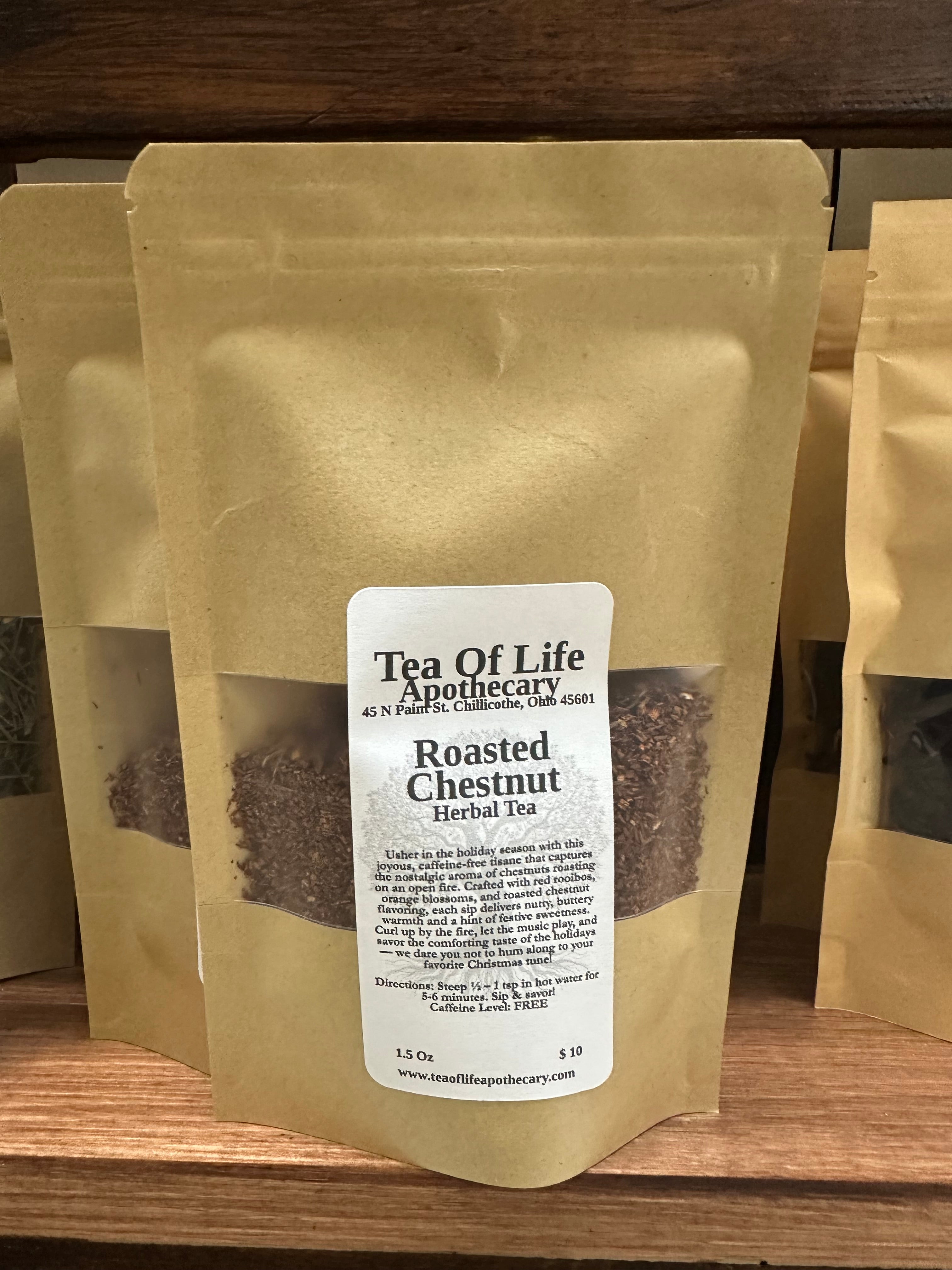 Usher in the holiday season with this joyous, caffeine-free tisane that captures the nostalgic aroma of chestnuts roasting on an open fire. Crafted with red rooibos, orange blossoms, and roasted chestnut flavoring, each sip delivers nutty, buttery warmth and a hint of festive sweetness. Curl up by the fire, let the music play, and savor the comforting taste of the holidays — we dare you not to hum along to your favorite Christmas tune!